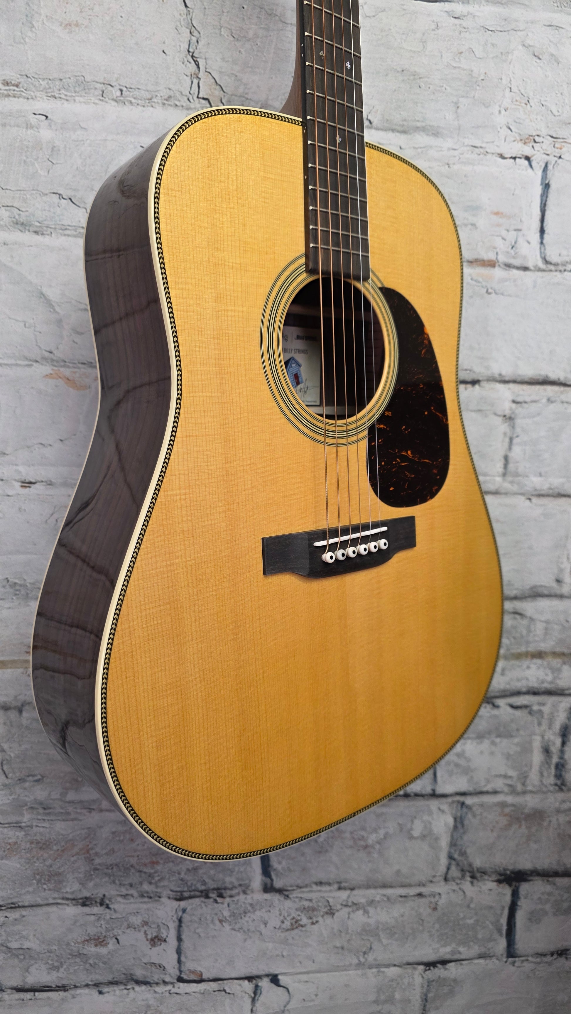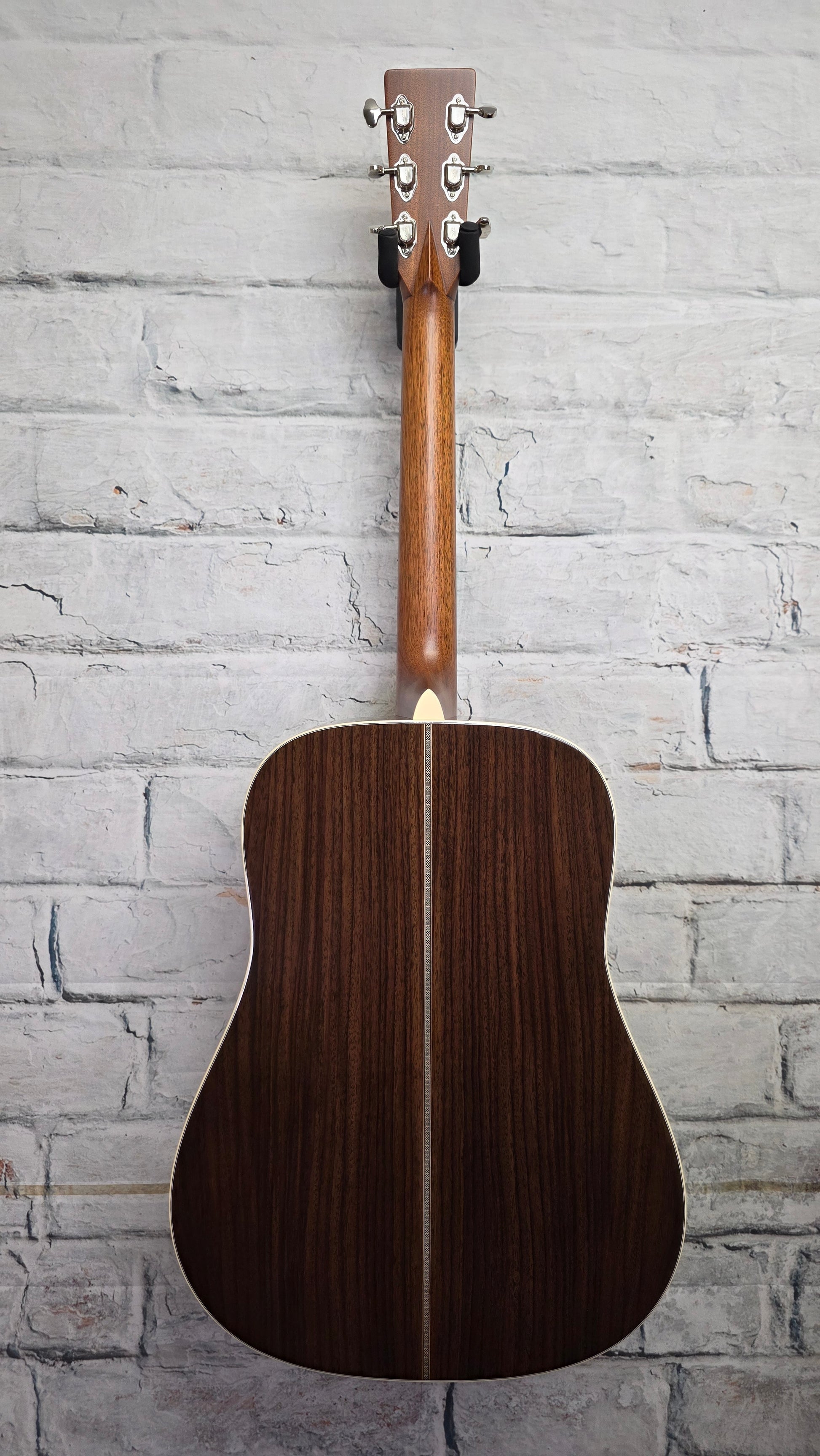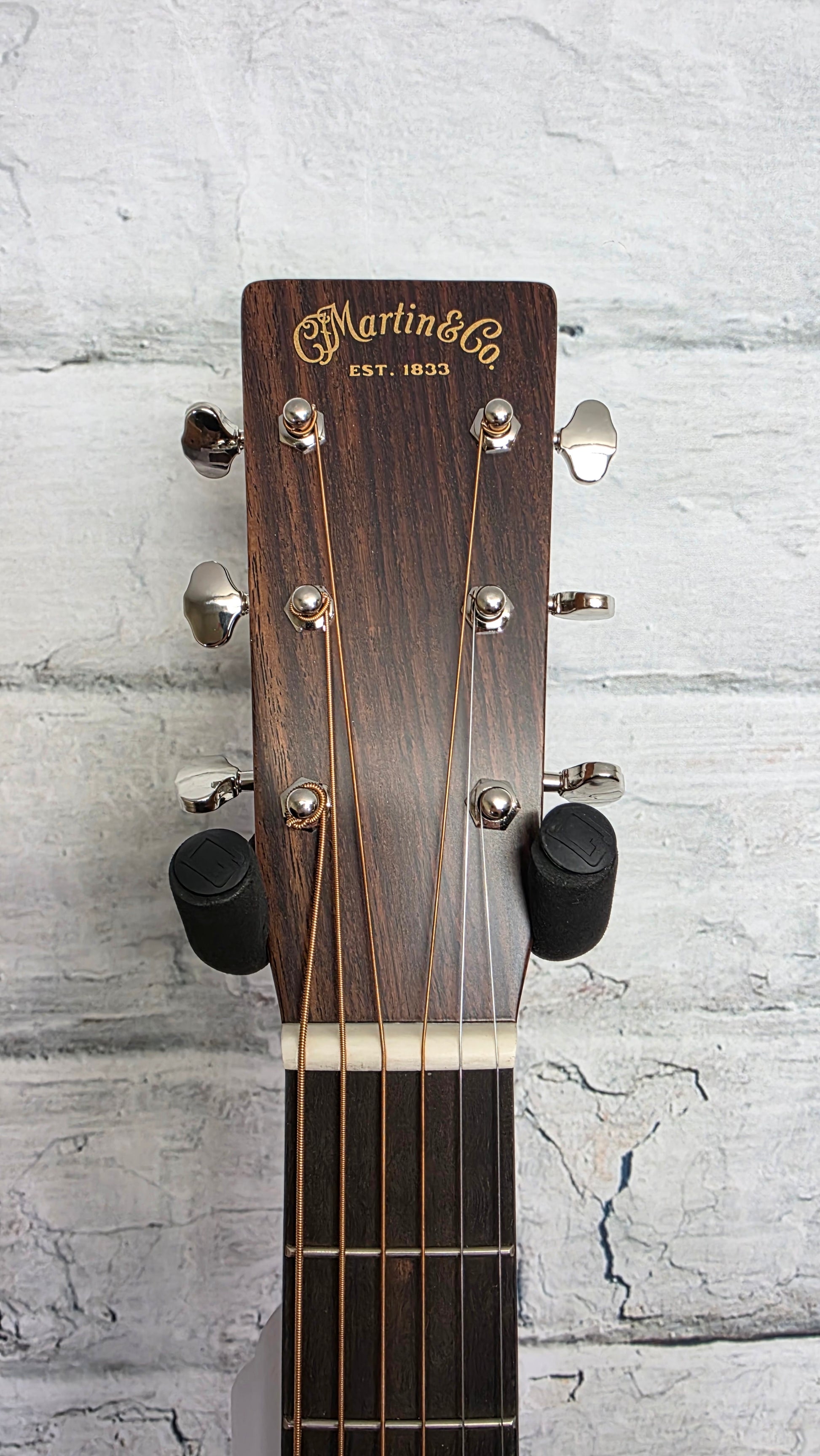 Inspired by Billy Strings' prized 1940 D-28, the Martin D-28 Billy Strings brings a modern twist to a classic pre-war design, incorporating features tailored to Billy's electrifying playing style. This signature Dreadnought showcases a unique 25" scale length, reducing string tension for fast, intricate playing and expressive bends – perfectly suited for Billy’s rapid-fire licks. With a custom nut width that’s slightly wider than his pre-war Martin and a modified low oval satin neck, it offers enhanced comfort and speed, ideal for players who crave agility up and down the neck. The solid East Indian rosewood back and sides and spruce top deliver a full, resonant tone with rich bass, while the bold herringbone trim, antique toner, and antique white binding add vintage flair. Nickel enclosed gear tuners, exclusive to Martin, and an ebony fingerboard with abalone diamond and square inlay round out the guitar’s looks and performance. It’s an ideal balance of traditional craftsmanship and modern playability, much like Billy’s genre-defying style. Each guitar features a custom paper label with his pre-printed signature and graphic.