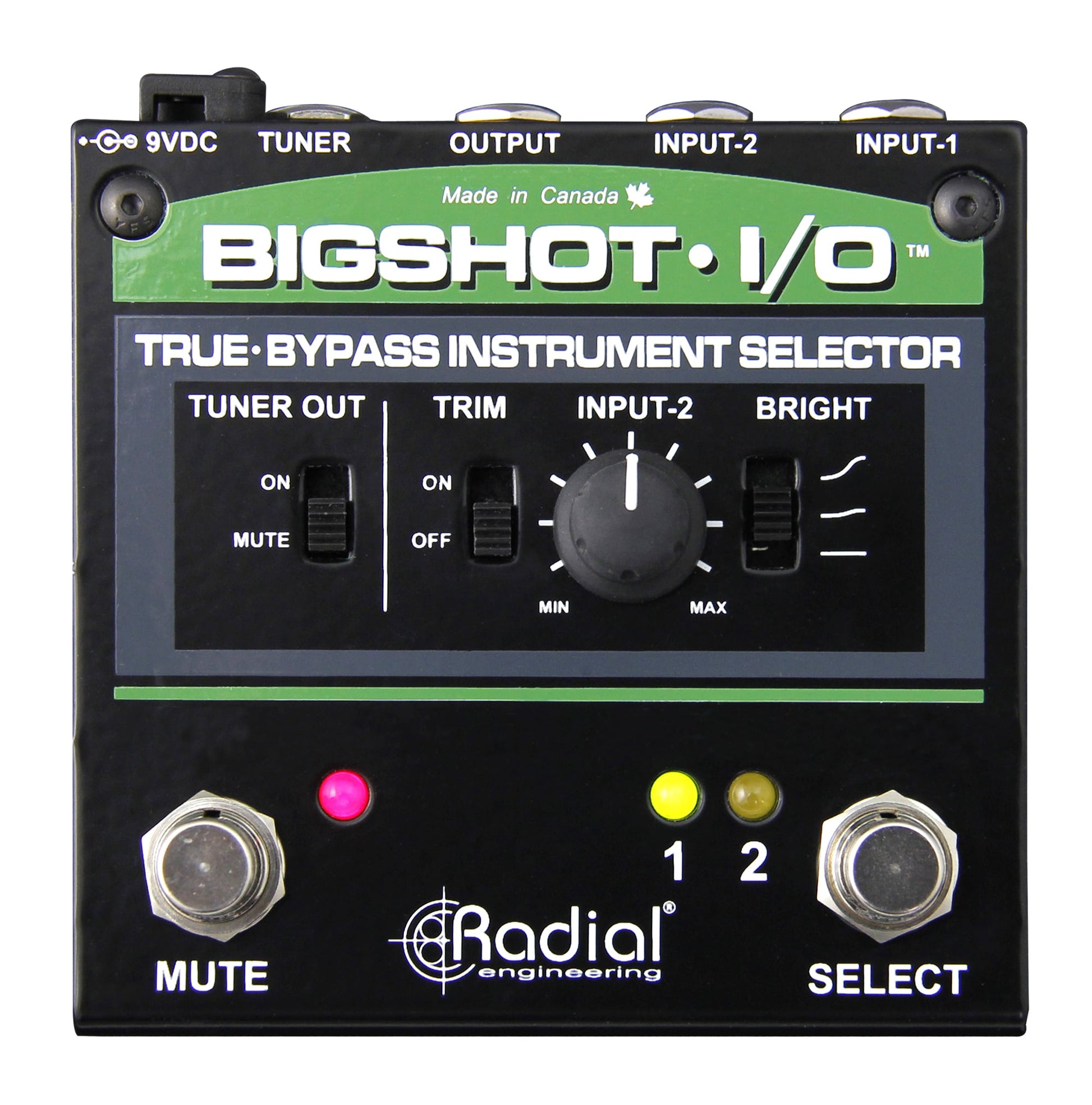 Radial Engineering's BigShot I/O switching pedal makes switching between two different instruments easy and reliable. The pedal's two switches allow you to select between two instruments on the fly or mute your entire signal. The BigShot I/O's onboard Trim and variable level for Input-2 ensure the level of your instruments can be exactly matched or dialed to taste. Flip the Tuner Out switch, and you'll enjoy constant monitoring of your tuning without affecting your signal. And the BigShot I/O is very popular for its passive, true-bypass design.